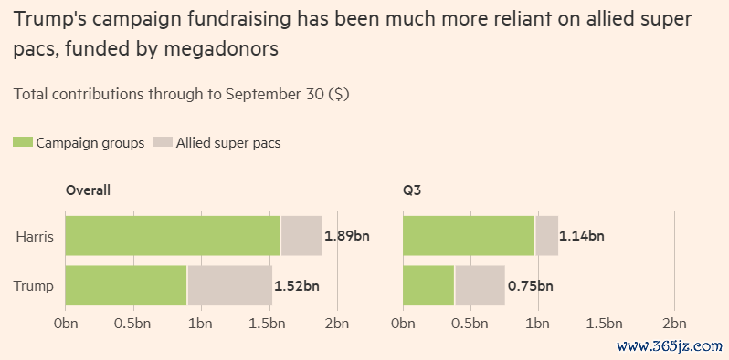 對比來看,民主黨候選東說念主從小額捐助者那處得回了更多的資金,而特朗普的競選資金更多依賴億萬富翁的扶助。